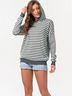 Особенности: Удлиненный джемпер прямого силуэта с капюшоном выполнен фактурной вязкой, из полушерстяной пряжи в контрастную мелкую полоску.