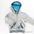 Свободный силуэт с капюшоном и втачным рукавом. Центральная застежка на молнию. Низ модели и рукавов фиксирован широкой резинкой. Вход в накладной карман и капюшон так же оформлены резинкой. Спинка оформлена аппликацией, на накладном кармане расположена нашивка.