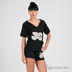 Стильная и комфортная толстовка из плотного хлопчатобумажного материала с короткими рукавами и капюшоном. Широкий V-образный вырез горловины. Два удобных накладных кармана. Полочка декорирована аппликацией с принтом. Будьте модной всегда - и в городе, и дома!