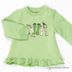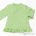 Детали: округлый вырез горловины, застежка на три кнопки на левом плечике, длинный рукав посажен на трикотажную манжету, оборка по нижней части изделия, полочка декорирована принтами