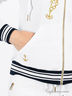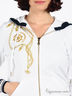 Толстовка из высококачественного, очень мягкого трикотажа с капюшоном. Капюшон на шнурке. Классический крой. Длинный рукав. Застежка - металлическая молния золотого цвета. Два кармана - кенгуру. Низ и манжеты изделия, а также капюшон оформлены трикотажной резинкой в белую полоску. Полочка изделия декорирована вышивкой с логотипом бренда.