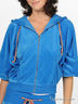 Велюровая толстовка с капюшоном. Рукава 3/4 кроя летучая мышь. Два кармана спереди. Застегивается на молнию. Край капюшона, низ изделия и края карманов посажены на трикотажную резинку.