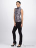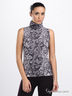 Стильный топ из мягкого, приятного на ощупь трикотажа с нежным лиловым рисунком. Воротник стойка. Без рукавов.