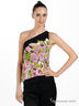 Детали: одна лямка средней толщины, вырез наискосок оголяет одно плечо полностью, изделие оригинальной расцветки в цветок.