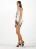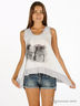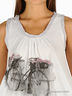 Топ расклешенного кроя из тонкого трикотажа. Овальный вырез горловины и края изделия обработаны нежным хлопком. На передней части изделия набивной рисунок. К топу прилагается тканевый пояс, который можно повязывать, как шарф.