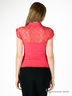 Трикотажный приталенный топ. Фигурный вырез. Воротник из широкой трикотажной резинки. Рукава-реглан. Рукава и кокетка на спине выполнены из кружевной ткани. Ворот оформлен многослойными нашивками в виде цветов.