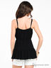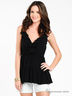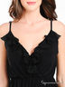 Детали: V-образный вырез с запахом; тонкие бретели регулируются по длине; талия и спинка сзади усилены резинкой; декорирован оборками и стразами