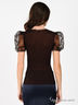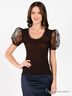 Детали: округлый вырез горловины декорирован бархатистой лентой, короткий рукав-фонарик из сетчатой ткани с вышивкой присборен на эластичную бархатистую ленту
