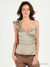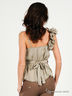 Детали: застежка на пояс из основного материала, по подолу небольшой волан, тонкие лямки, одна отделана воланом, небольшая вставка из металла с логотипом бренда.