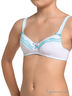 Идеальный «первый бра» для девочек среднего и старшего школьного возраста. Комфортная модель анатомического кроя на регулируемых бретелях с классической застёжкой на спине, выполнена из хлопчатобумажного трикотажа высочайшего качества с добавлением эластана для совершенной посадки на теле. Бра белого цвета, отделан изысканным кружевом и эластичной резинкой с фестонным краем нежно-голубого цвета. Модель украшена шёлковым бантиком с пуговицей в виде сердечка и стильным логотипом на задней детали изделия.
