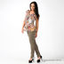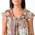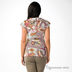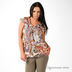 Трикотажный топ с пестрым принтом. Короткие рукава-крылышки. Воротник-шалька ложится мягкими складками. На груди выполнена драпировка.