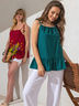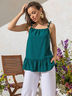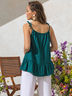 Расклешенный топ благородного цвета тёмной бирюзы с широкой оборкой по низу. Завязки с деревянными бусинами акцентируют внимание на линии декольте, переходя в кулиску на горловине.