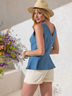 Льняной топ без рукавов с глубоким V-образным вырезом горловины спереди и сзади. Модель отрезная по талии с расклешенной баской. Застегивается на крупные пуговицы по полочке.
