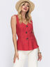 Льняной топ без рукавов с глубоким V-образным вырезом горловины спереди и сзади. Модель отрезная по талии с расклешенной баской. Застегивается на крупные пуговицы по полочке.