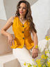 Льняной топ без рукавов с глубоким V-образным вырезом горловины спереди и сзади. Модель отрезная по талии с расклешенной баской. Застегивается на крупные пуговицы по полочке.