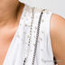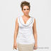 Стильный топ без рукавов с ниспадающей горловиной. Топ украшен жемчужными бусинами и цепочками.