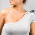 Стильный облегающий топ с лямкой на одно плечо и атласным рукавом.