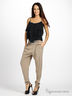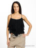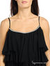 Топ на тонких бретелях с округлым круглым вырезом горловины, украшенный металлической цепочкой. Передняя планка топа - ассиметричный волан.
