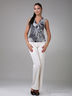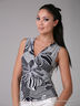 Элегантный и комфортный приталенный топ со стильным рисунком. V-образный вырез с запахом прекрасно подчеркивает грудь и линию шеи. Без рукавов.