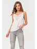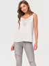 • Особенности: Топ свободного силуэта из блузочной ткани на подкладке. Детали: кружевная вставка по переду, тонкие бретели без регулировки. Без застежки.