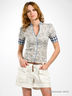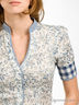 Легкая блузка из хлопка с коротким рукавом. Невысокий воротник-стойка. Декоративные манжеты контрастной расцветки. Застежка на пуговицы.