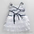 Расклешенная модель на скрещенных бретельках застегивается на скрытую молнию в левом боковом шве. В спинке вставка из многорядной резинки. Юбка с множеством прозрачных оборок. Лиф украшен контрастными лентами и стразами.