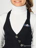 Стильный трикотажный топ темно-синего цвета. Завязывается на шее. V-образный вырез. На полочке застежка на пуговицах. Талия выполнена из трикотажа в рубчик. Верх спинки посажен на трикотажную резинку. Украшена съемным атласным бантиком с бусинами.