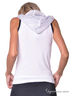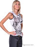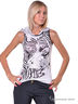 Оригинальный топ с сетчатым капюшоном, лямками и округлым вырезом горловины. Полочка декорирована принтом и стразами.