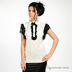 Трикотажный топ из приятного на ощупь материала. Воротник стойка. Проймы и планка на полочке украшены оборками. Низ изделия посажен на трикотажную резинку.