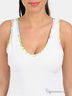 Детали: широкие бретели и v-образный вырез горловины дополнены сетчатыми цветными лентами