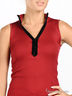 Стильный топ из легкого, приятного на ощупь трикотажа в рубчик. Воротник стойка. Вырез декорирован черным бархатом.