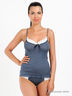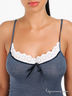 Детали: v-образный вырез горловины, тонкие, регулируемые по длине бретели. Изделие декорировано кружевной тесьмой и атласной лентой