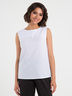 Топ прямого силуэта выполнен из плательной ткани. Нагрудные вытачки по переду обеспечивают комфортную посадку. Округлый вырез горловины и проймы обработаны цельнокроенной обтачкой.