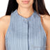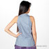 Легкий топ без рукавов выполнен из хлопкового батиста. Воротник-стойка застёгивается на пуговичку спереди. На груди застежка на пуговицы скрыта планкой. Перед выполнен в виде манишки, заложенной складками. Силуэт топа приталенный.