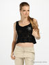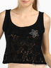 Нет более изысканного и женственного материала, чем кружево! Волнующее, полупрозрачное, но элегантное - выбор настоящей женщины. Короткий приталенный топ из черного ажурного кружева. Глубокая круглая горловина. Особая изюминка модели - цвет из крупных страз на груди.