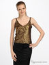Приталенный топ на тонких бретельках. V-образный вырез прекрасно подчеркнет грудь. Легкий материал вышит золотым люрексом.