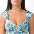 Очаровательный женский топ с ярким принтом. Глубокий вырез горловины. Широкие отрезные бретели присборены по линии отреза. На полочке декоративная брошь.