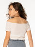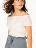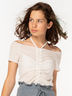 Трикотажный топ с регулируемой сборкой посередине. Открытые плечи и тонкие съёмные лямки.