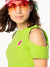 Укороченный топ с коротким рукавом из рельефного трикотажа. Открытые плечи и стикер-принт.