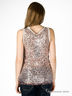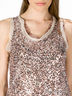 Удлиненный топ прямого кроя. Круглый ворот горловины, широкие проймы. Горловина и проймы окантованы рюшами с необработанными краями. Верхняя часть топа из сетчатого материала, полностью украшена паетками. Подкладка из шифона.