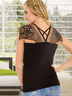 Замечательный топ с короткими рукавами и округлым вырезом горловины. Модель дополнена вставкой из контрастной по фактуре ткани. Отличный вариант для создания повседневного образа.