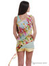 Яркий топ 2 в 1 - верхний топ с открытым плечом, скроенный по косой из прозрачного шифона с разноцветным рисунком. Удлинен сбоку. Нижний однотонный топ-майка с круглым вырезом. Бретели и вырез с деталями из атласа.