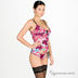 Элегантный топ на тонких регулируемых бретелях. У топа V-образным вырез горловины, украшенный спереди бантиком из атласной ленты. Яркий цветочный принт имеет эффект батика. На спине фирменный логотип.