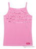 Топ из эластичного трикотажа в тонкую полоску. Регулируемые по длине бретели. Горловина оформлена рюшами.