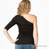 Удлинённый топ на одно плечо. Изделие по всей длине, а также рукав задраппированы на резинку. Спереди выполнены треугольные вставки из черной сетки.
