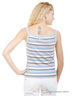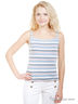 Топ в разноцветную полоску в рубчик 1x1, с однотонной окантовкой и 3 люверсами на бретелях шириной 2,5 см. Боковые разрезы 6 см для разм.50-52.