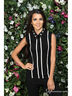 Стильный топ без рукавов с фигурным вырезом горловины. Модель выполнена в контрастной расцветке в полоску. Изделие прекрасно комбинируется с любым предметом гардероба. Горловина украшена множеством декоративных элементов. Отличный вариант на каждый день.