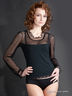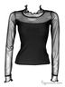 Облегающий топ из плотного эластичного полотна с полупрозрачными рукавами. Низ кофточки, горловина и рукава оторочены бархатным кантом. Горловина и рукава - воланы из жатой ленты с атласной лентой.