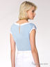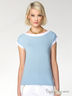 Стильный топ с короткими рукавами и округлым вырезом горловины. Эластичный вискозный трикотаж с контрастными окантовками манжет и горловины, на рукавах белые паты с золотистыми пуговками.