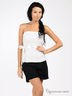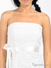 Приталенный ажурный топ без бретелек. Спинка посажена на многорядную резинку. На талии атласный пояс в тон изделия. Атласная подкладка.